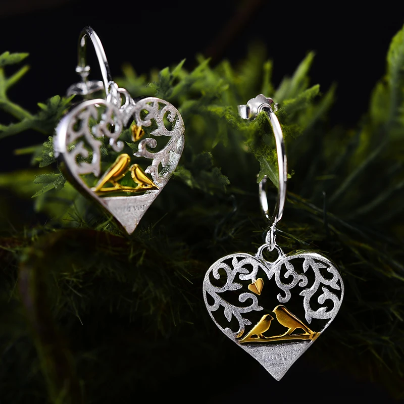 Best Lotus Fun Real 925 Sterling Silver Handmade Fine Jewelry Romantic Bird in Love Heart Shape Drop Ear