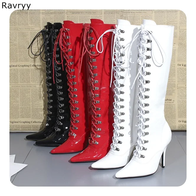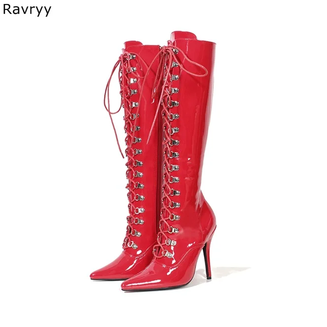 Red Patent Leather Woman long boots Cross tied Knee-high Boot Hot Fashion Model Fun Club Party fema